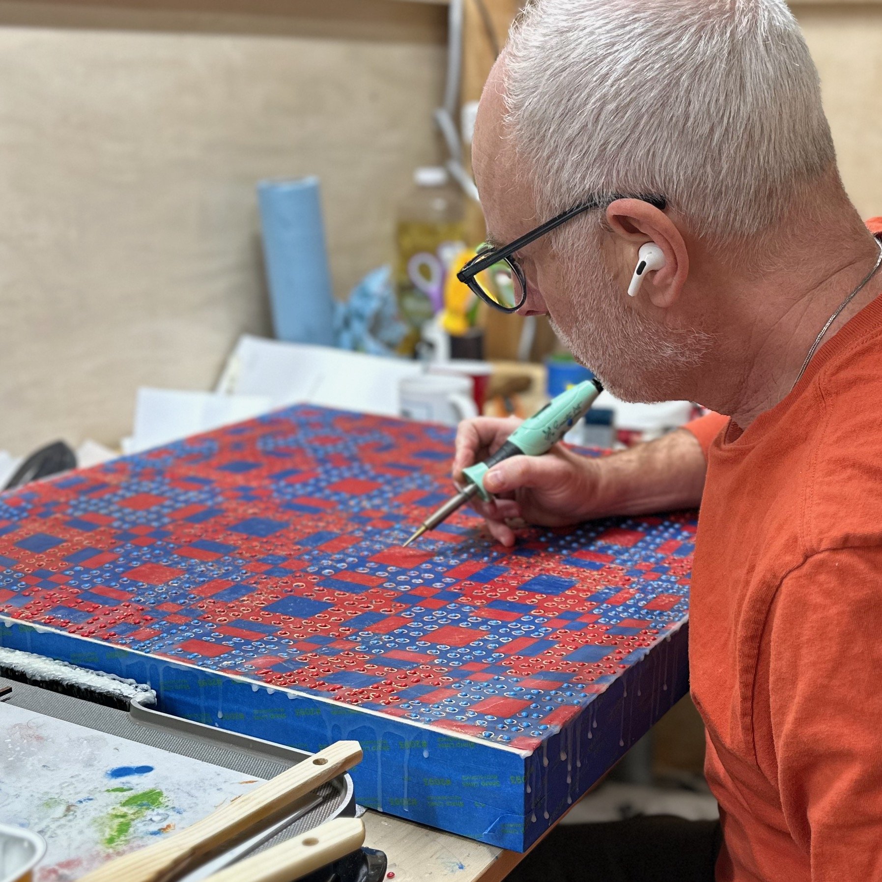 My encaustic process involves meticulously applying dots of pigmented wax with a stylus, rooted in techniques of stippling and pointillism. This careful, repetitive method creates tactile surfaces that evoke the delicacy of needlepoint or the dimensional quality of textile arts. My works often draw viewers into a physical interaction—people feel instinctively compelled to reach out and touch the textured surfaces.