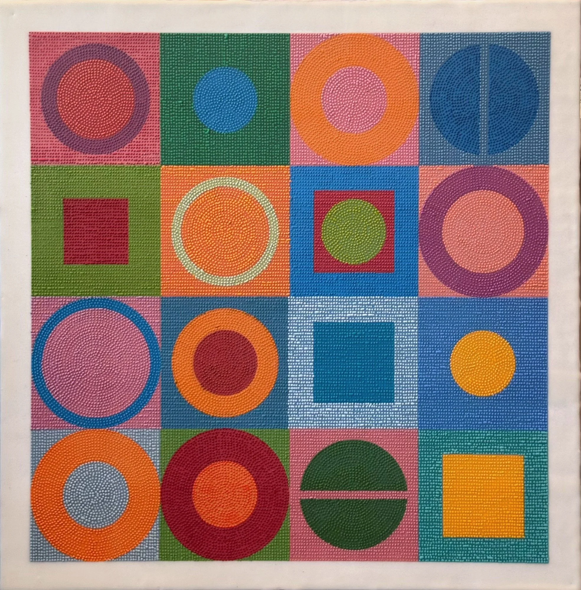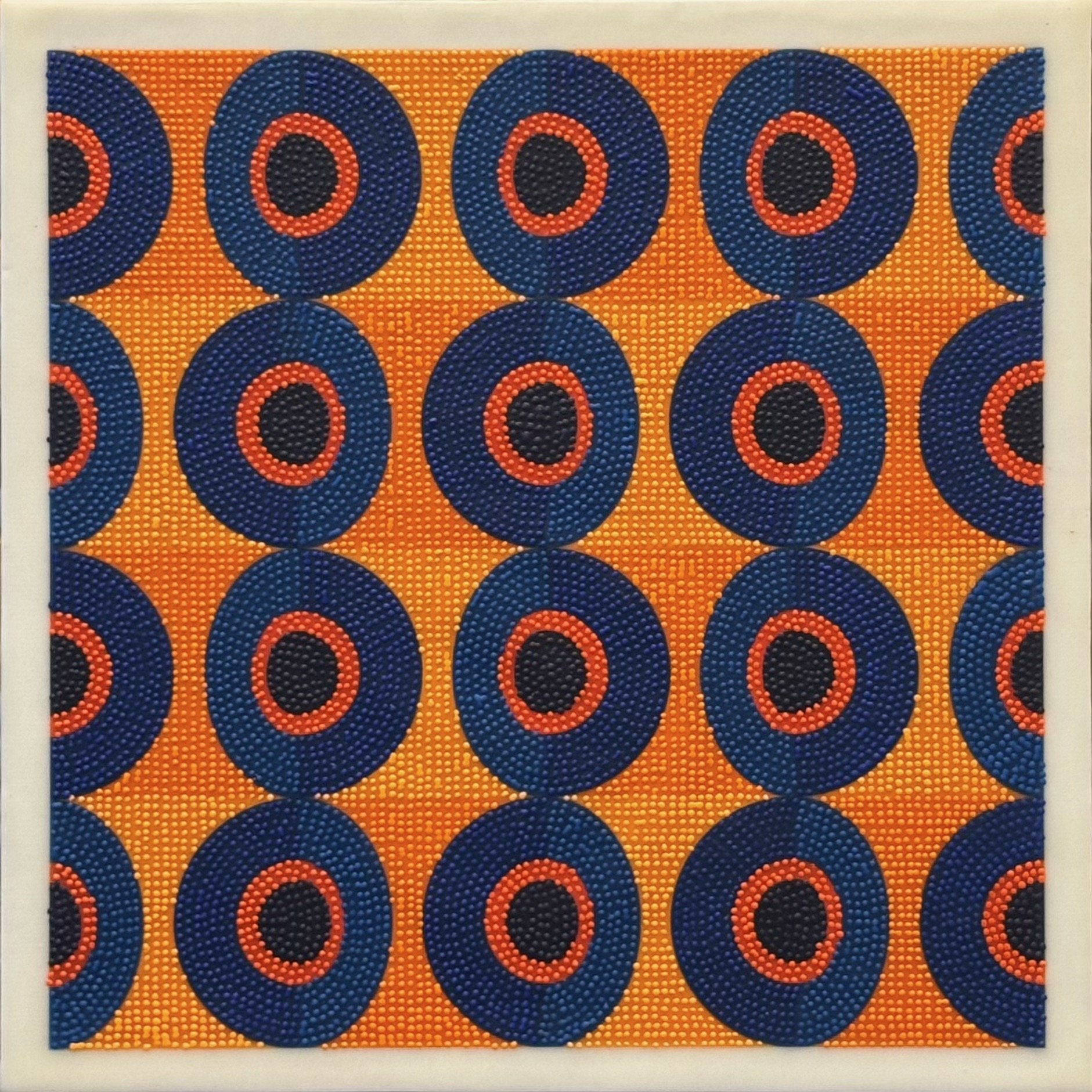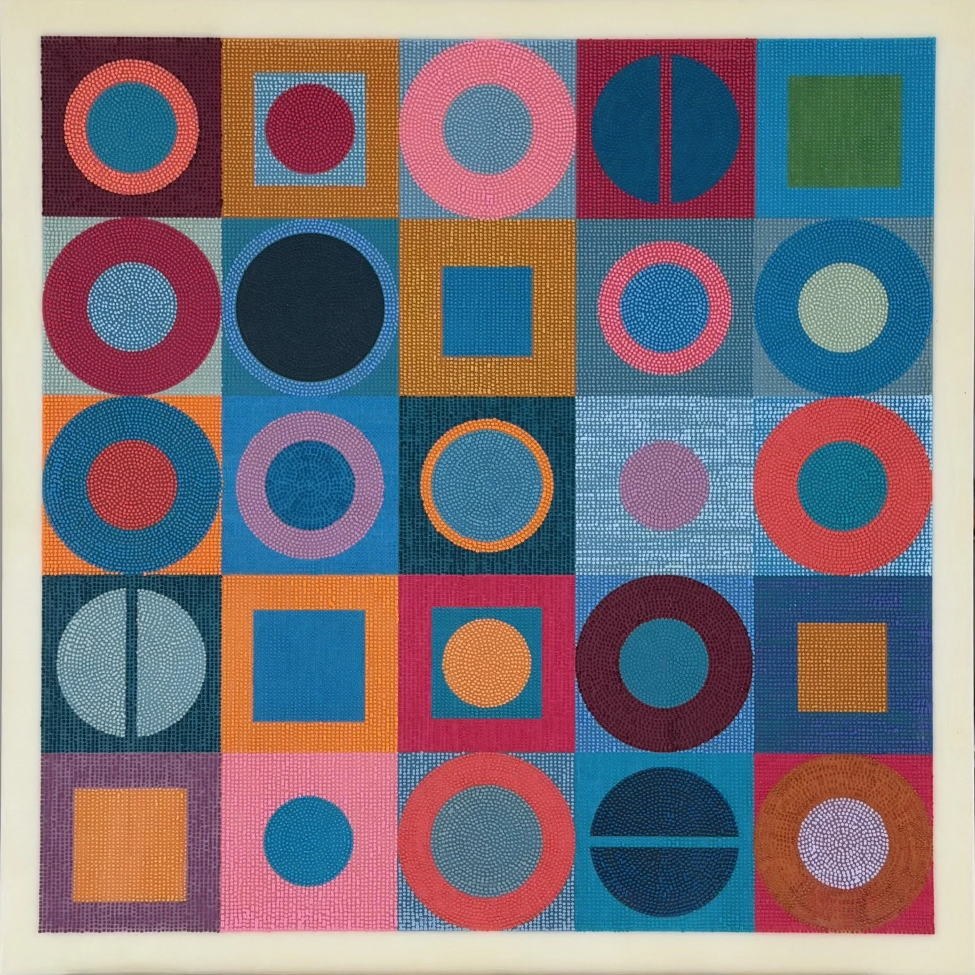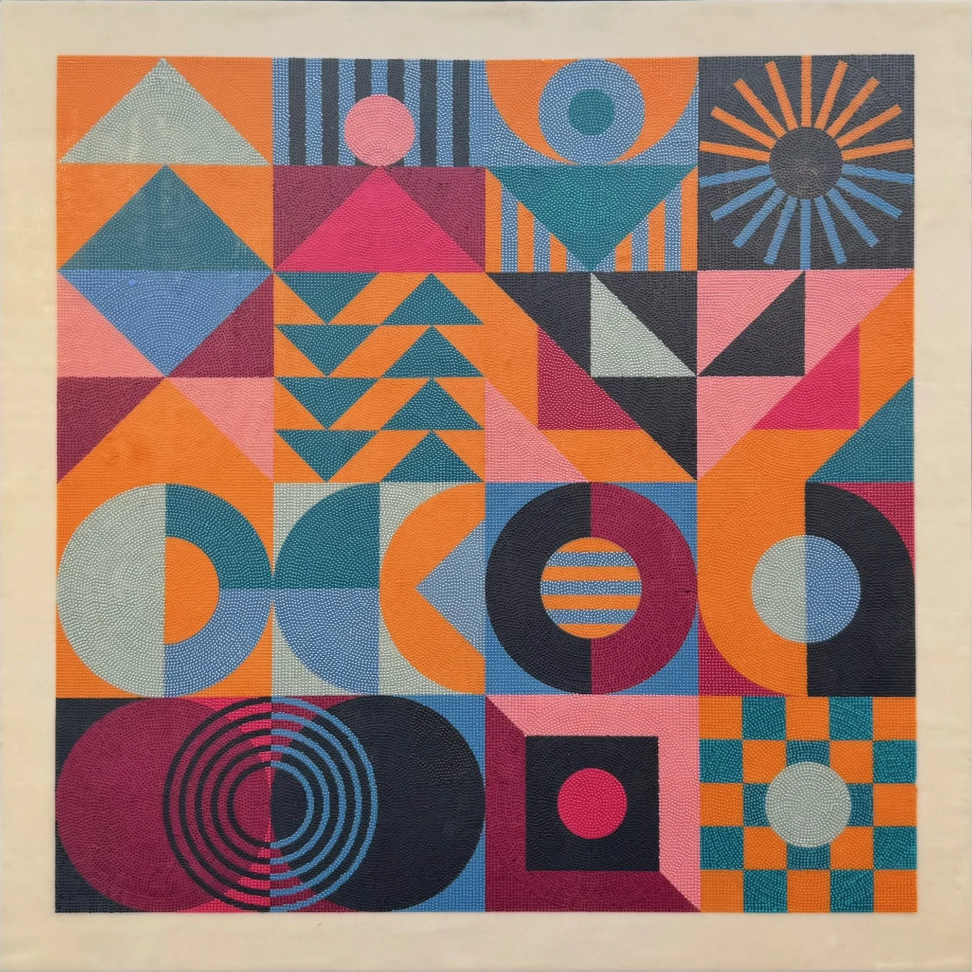 This collection brings circles and squares into conversation through layered wax dots and balanced palettes, creating geometric abstractions that pulse with movement, structure, and quiet harmony.