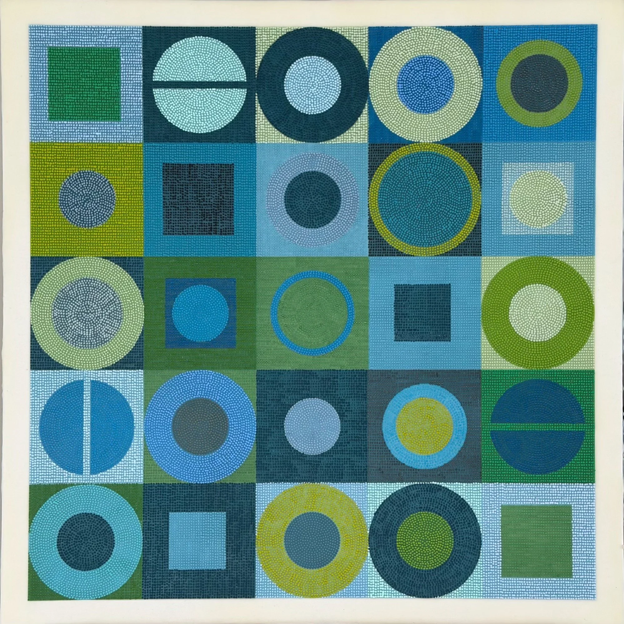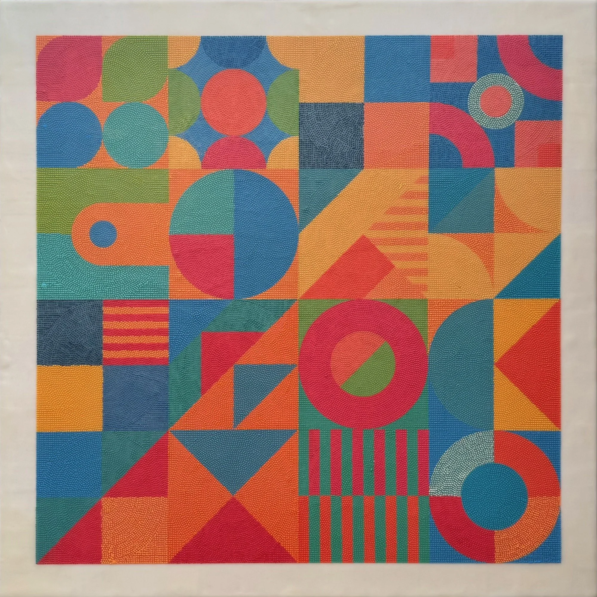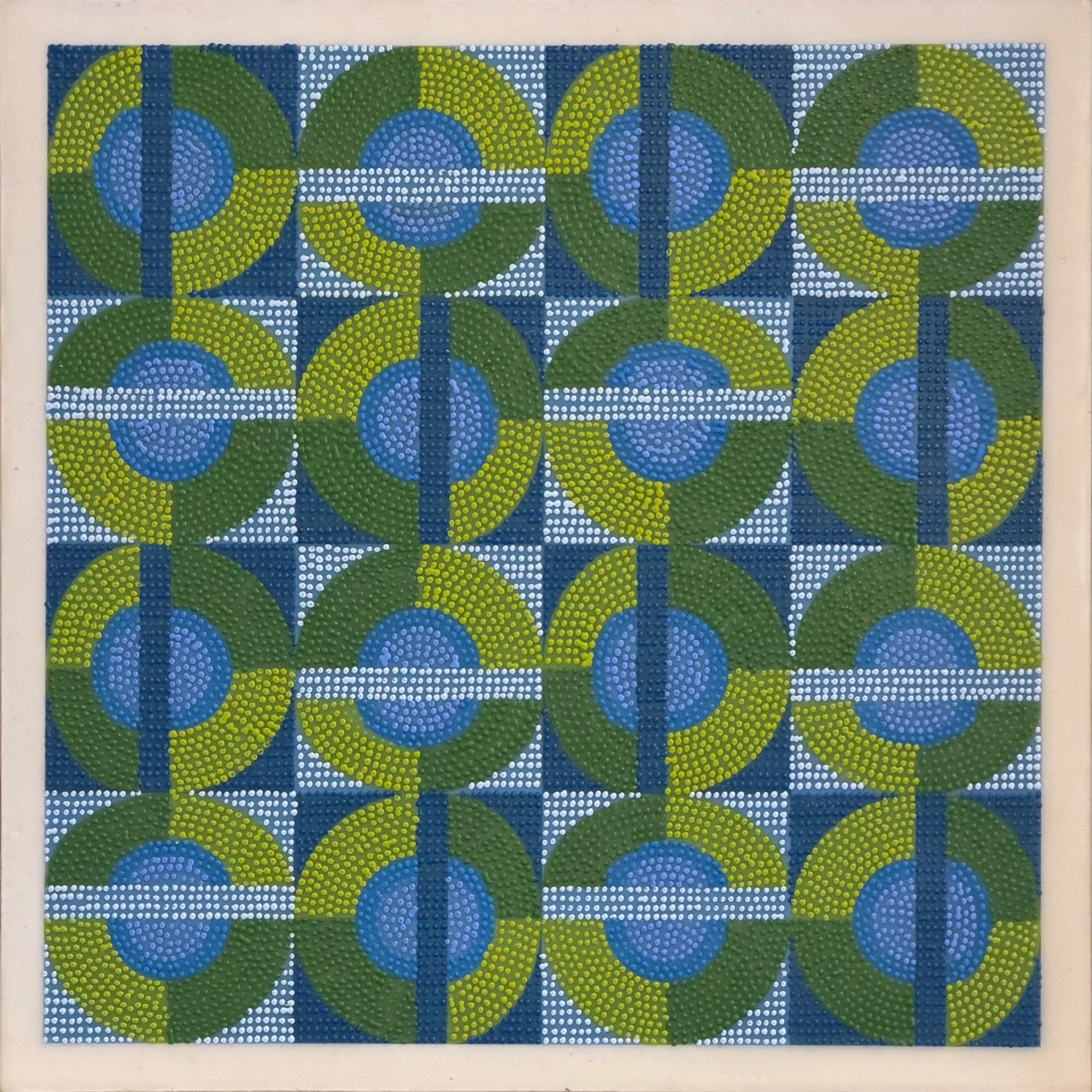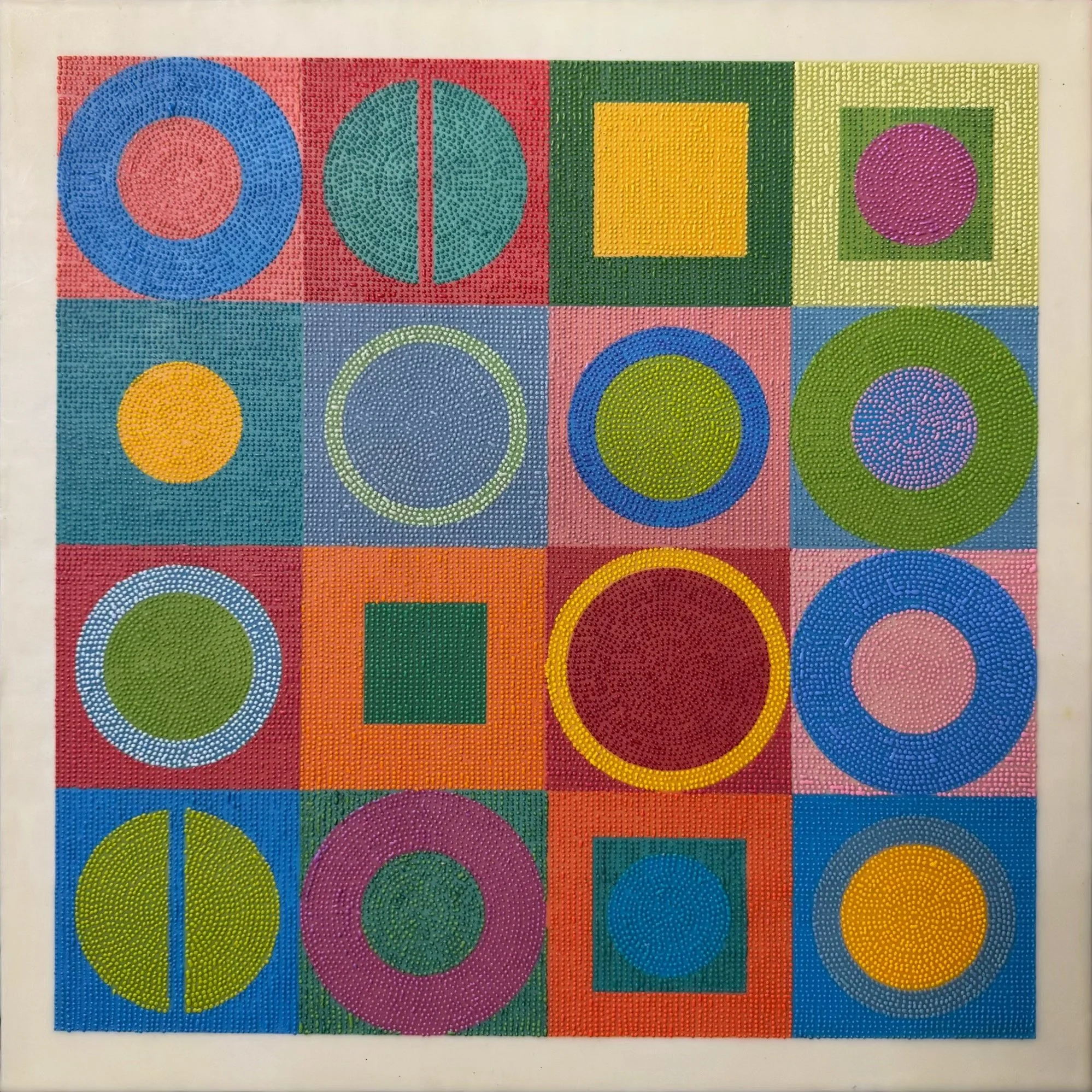 This collection brings circles and squares into conversation through layered wax dots and balanced palettes, creating geometric abstractions that pulse with movement, structure, and quiet harmony.