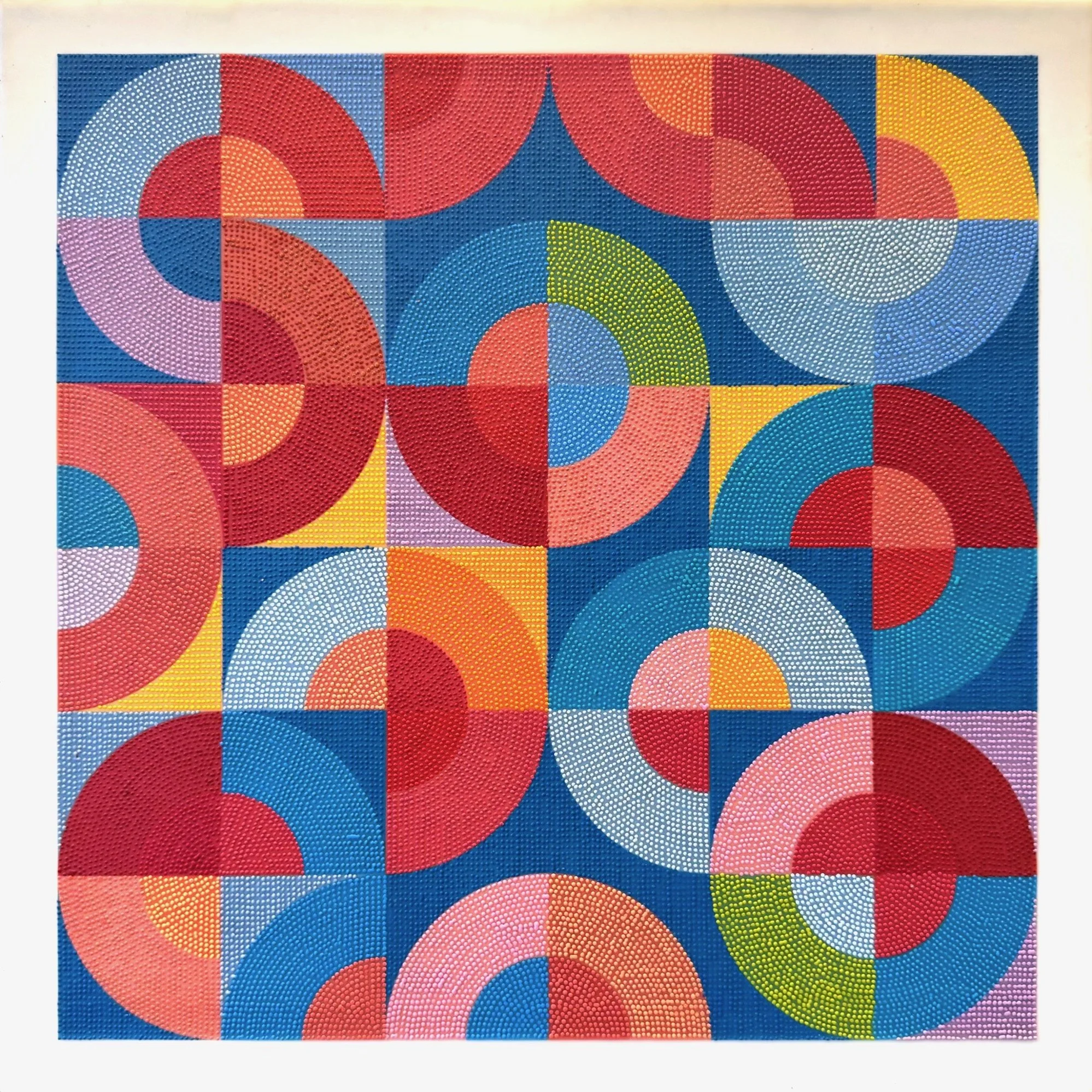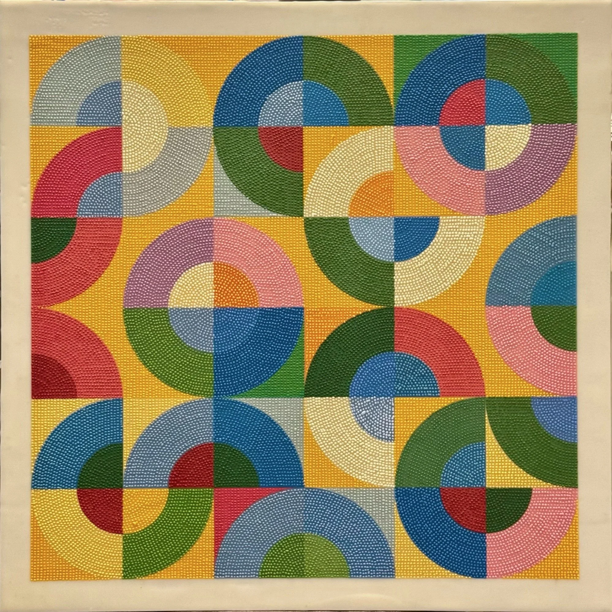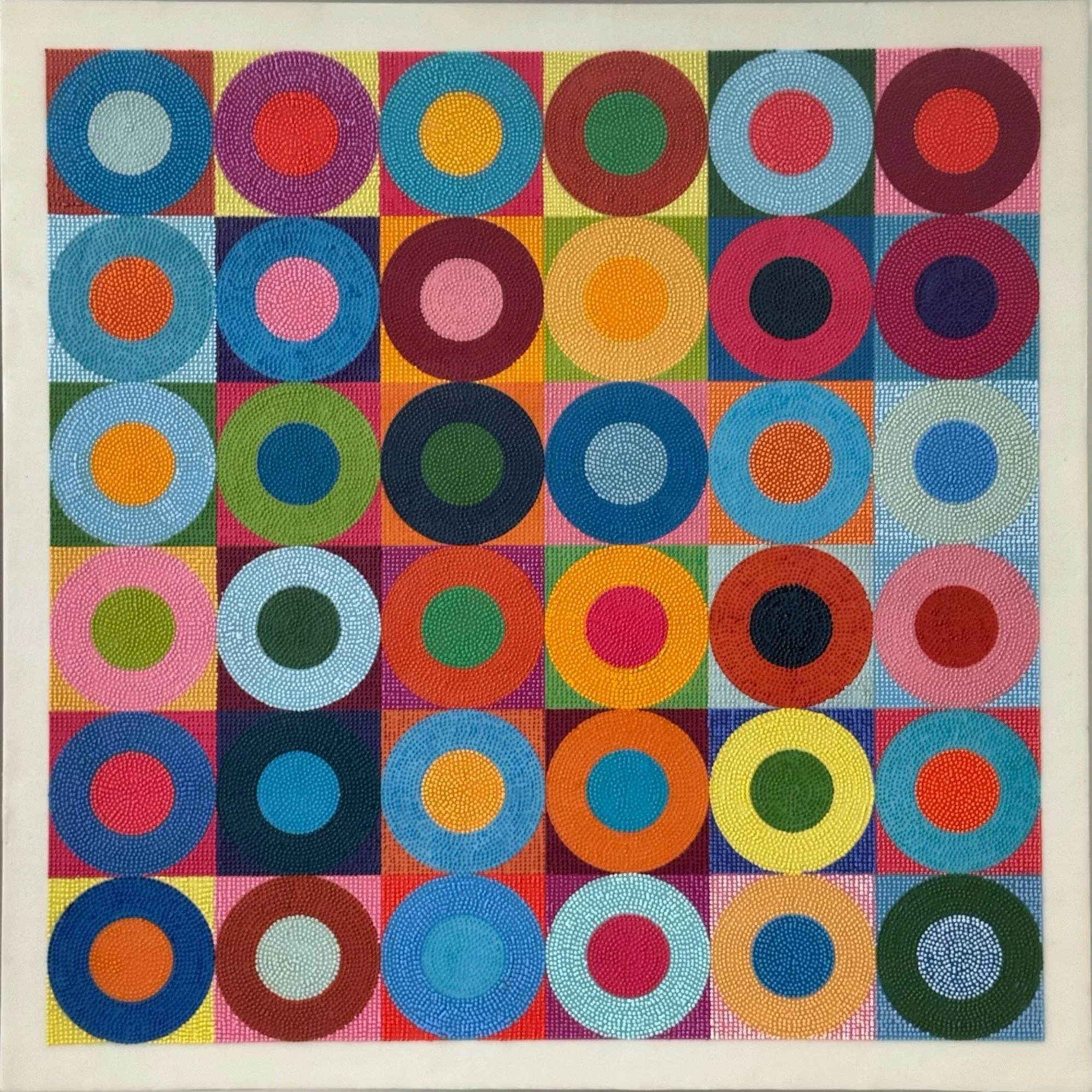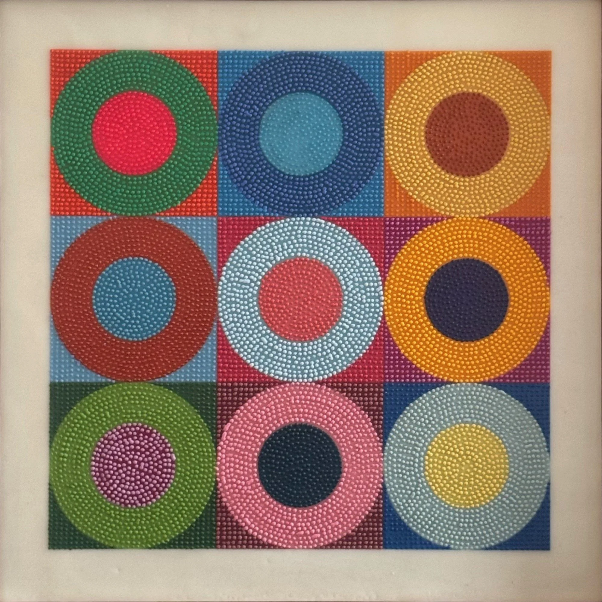 Radiant Circles explores how color, rhythm, and light interact within simple circular forms, creating compositions that feel both meditative up close and vibrantly alive from across the room.