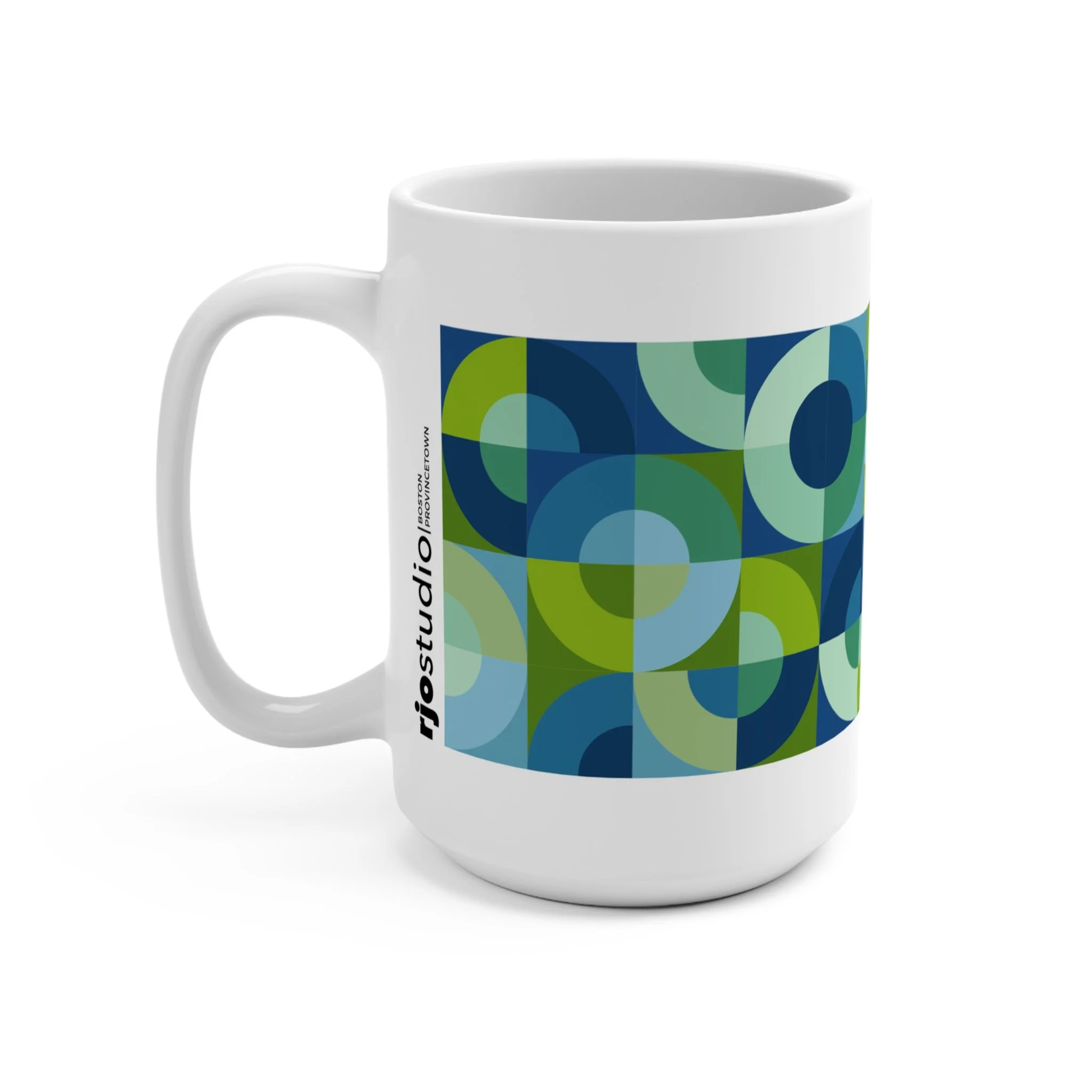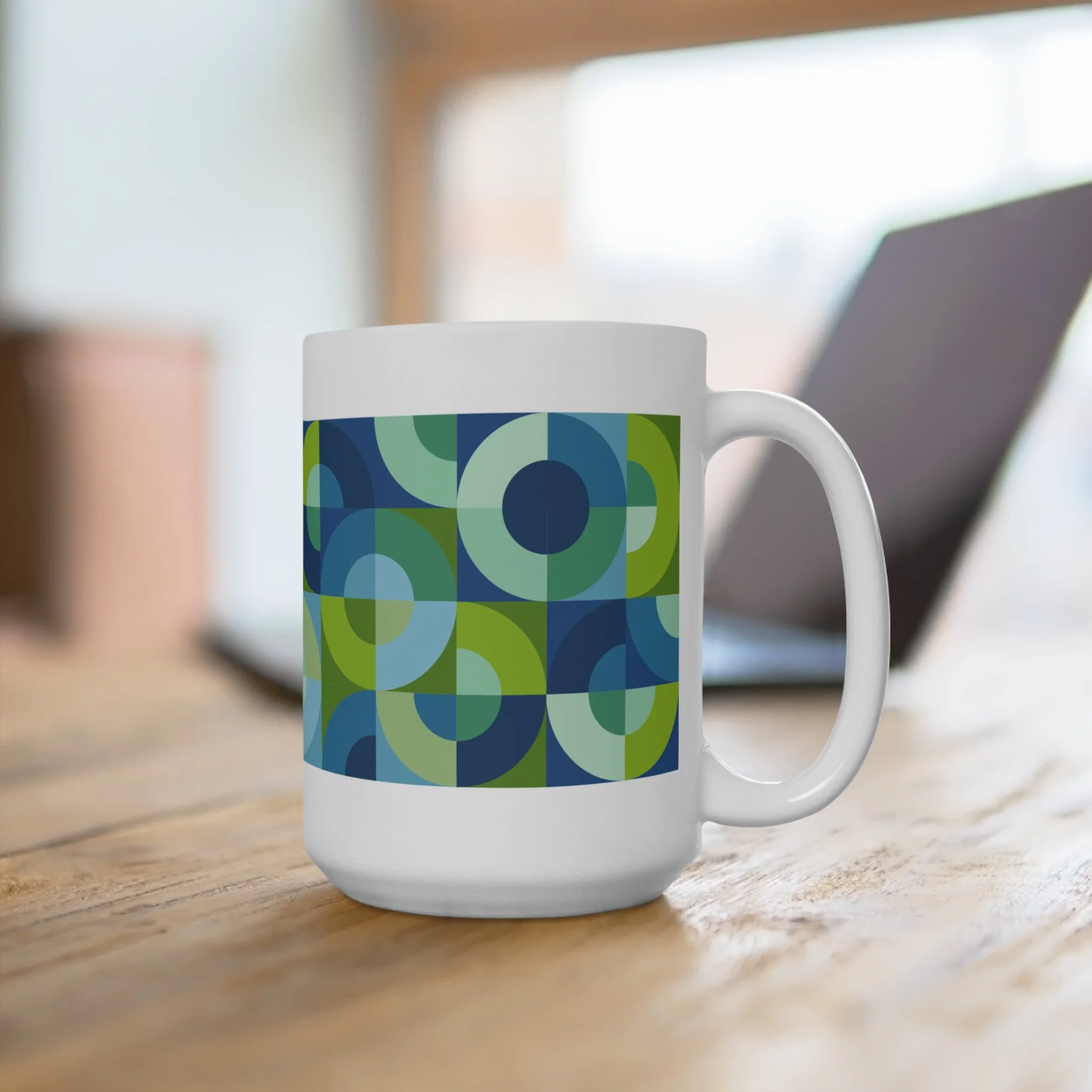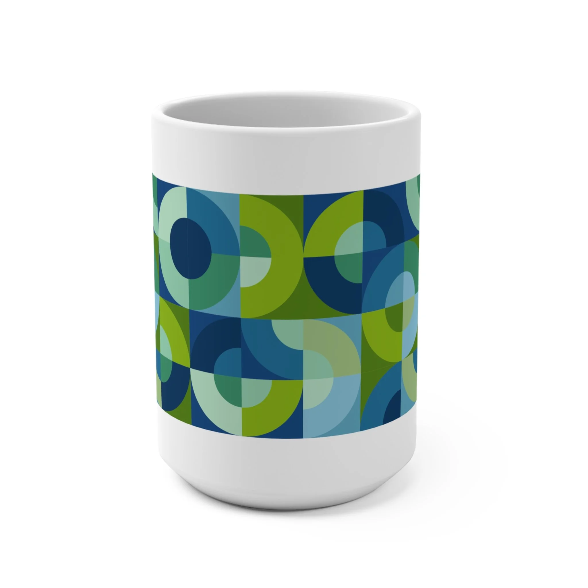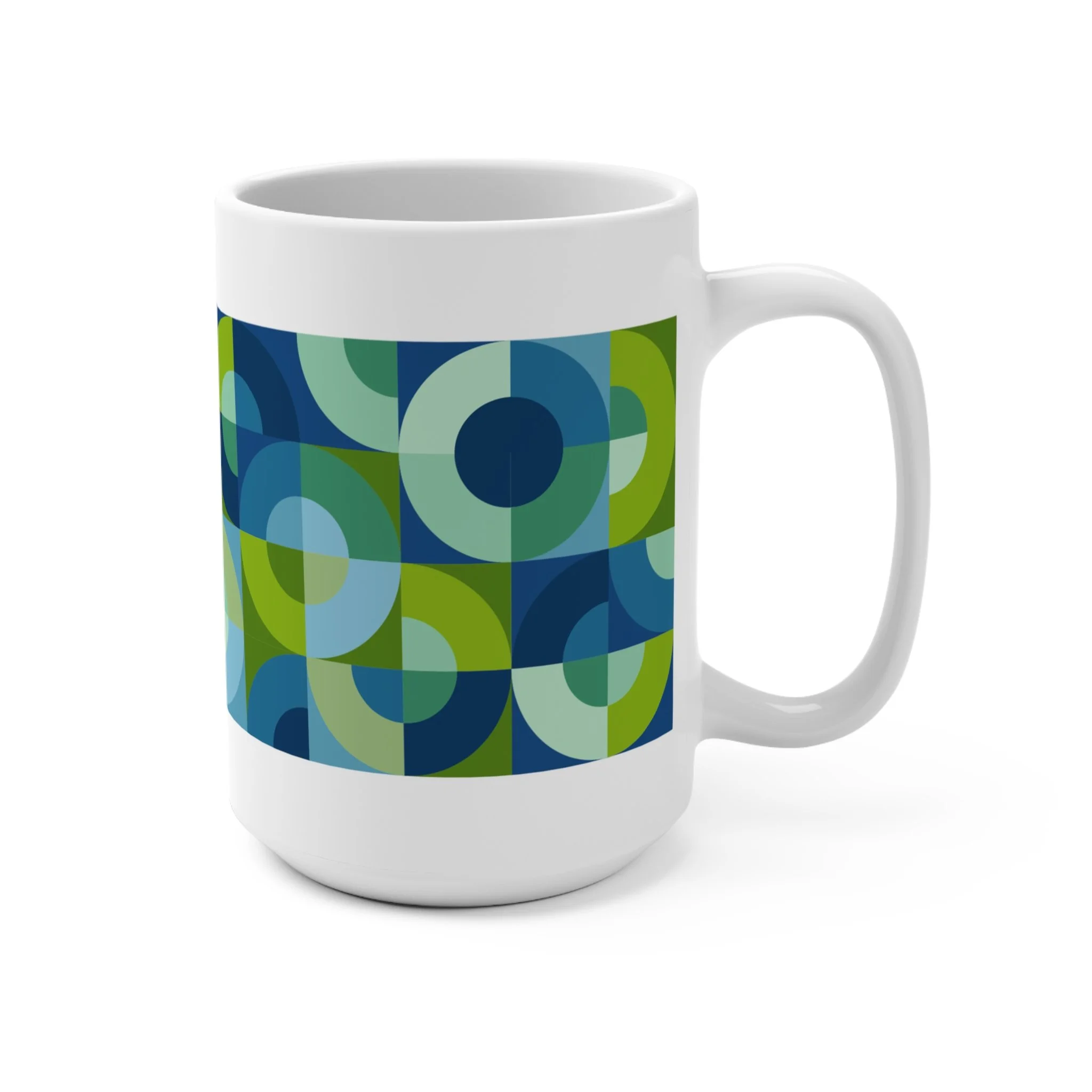 Inspired by the classic Drunkard’s Path quilt block, these 15oz ceramic mugs transform sweeping curves and shifting color fields into a modern, full-wrap pattern. Each mug feels alive with movement—half-circles meeting at crisp edges, arcs bending into one another, colors stacking to create depth, motion, and quiet visual harmony.