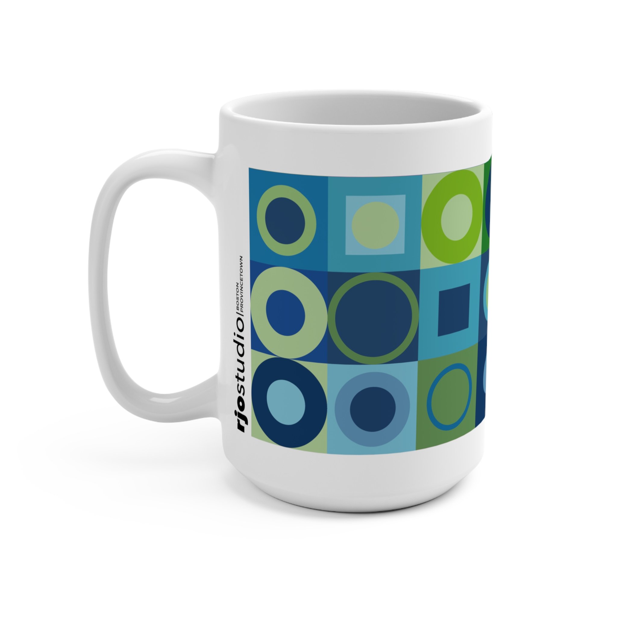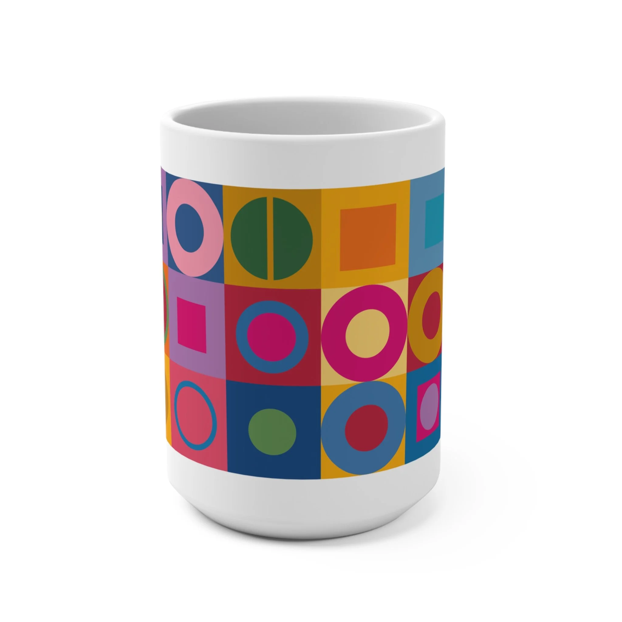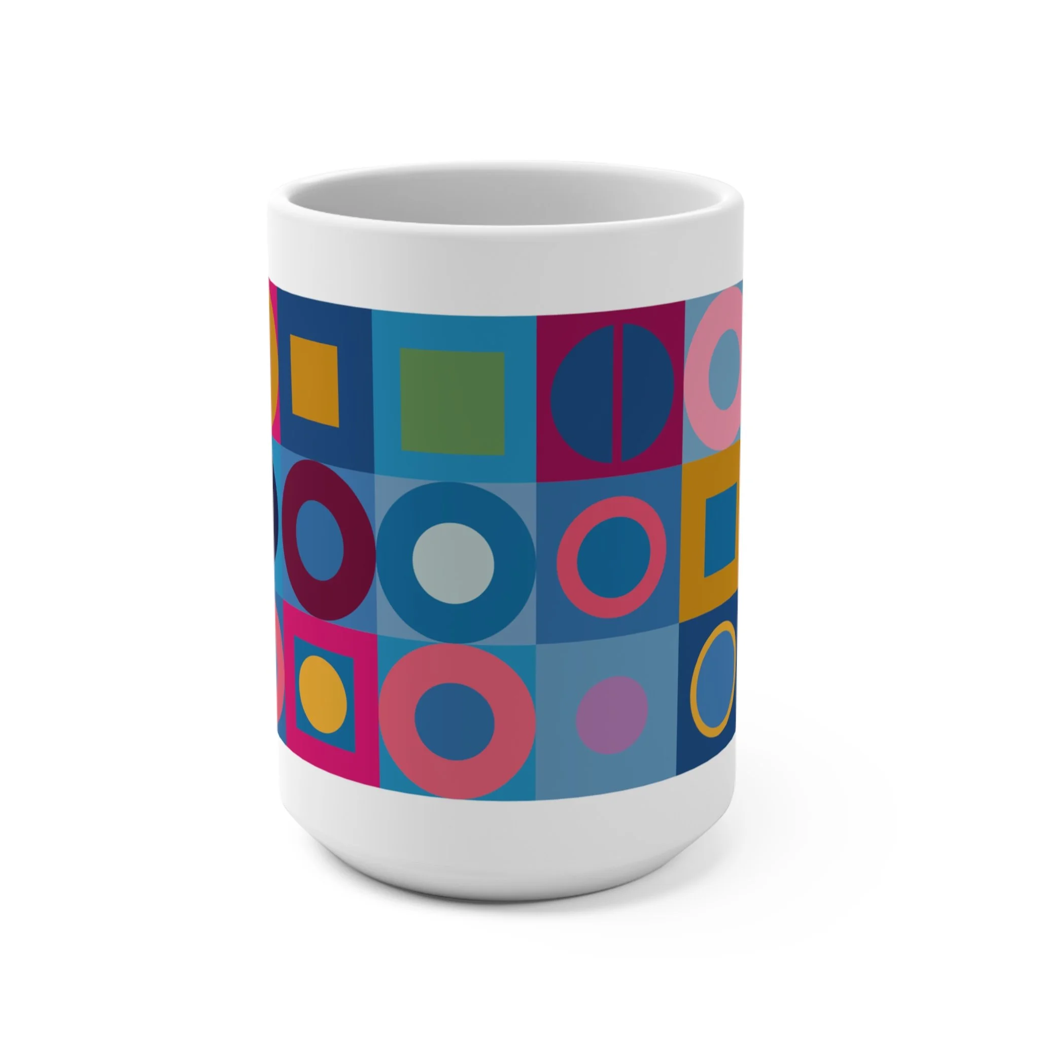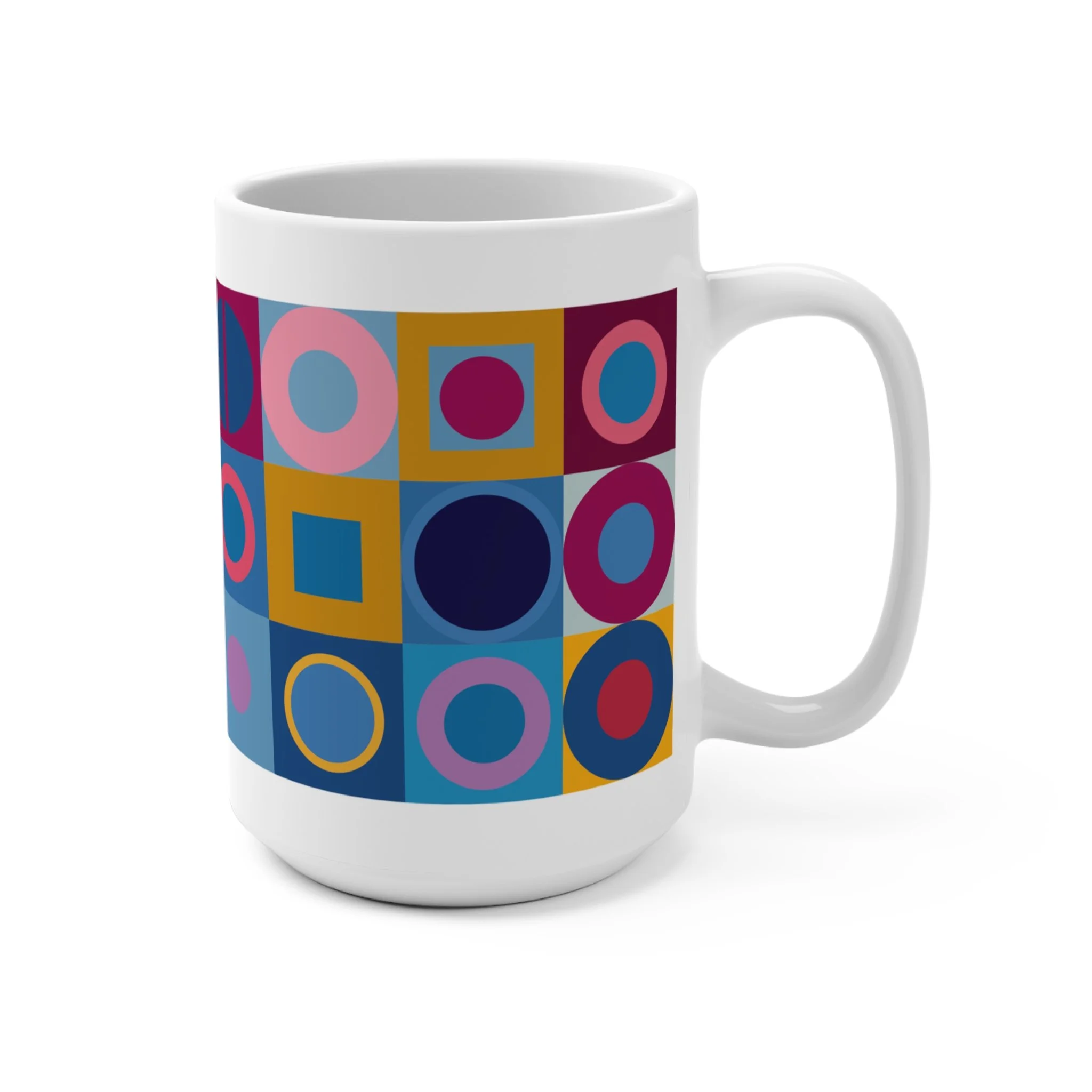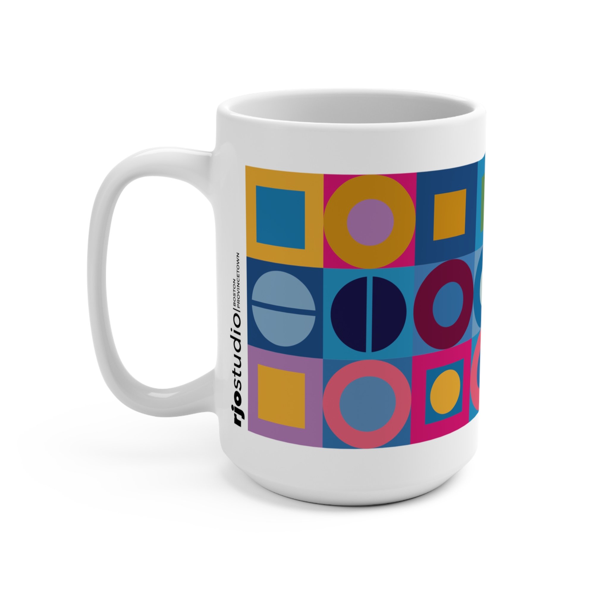 Inspired by my Harmony in Circles and Squares series, this 15oz ceramic mug transforms one of my geometric grids into an object you can hold, sip from, and live with. The pattern wraps fully around the mug—crisp, vibrant, and unmistakably rjostudio—turning a morning coffee, late-night tea, or studio break into a small moment of color and rhythm.
