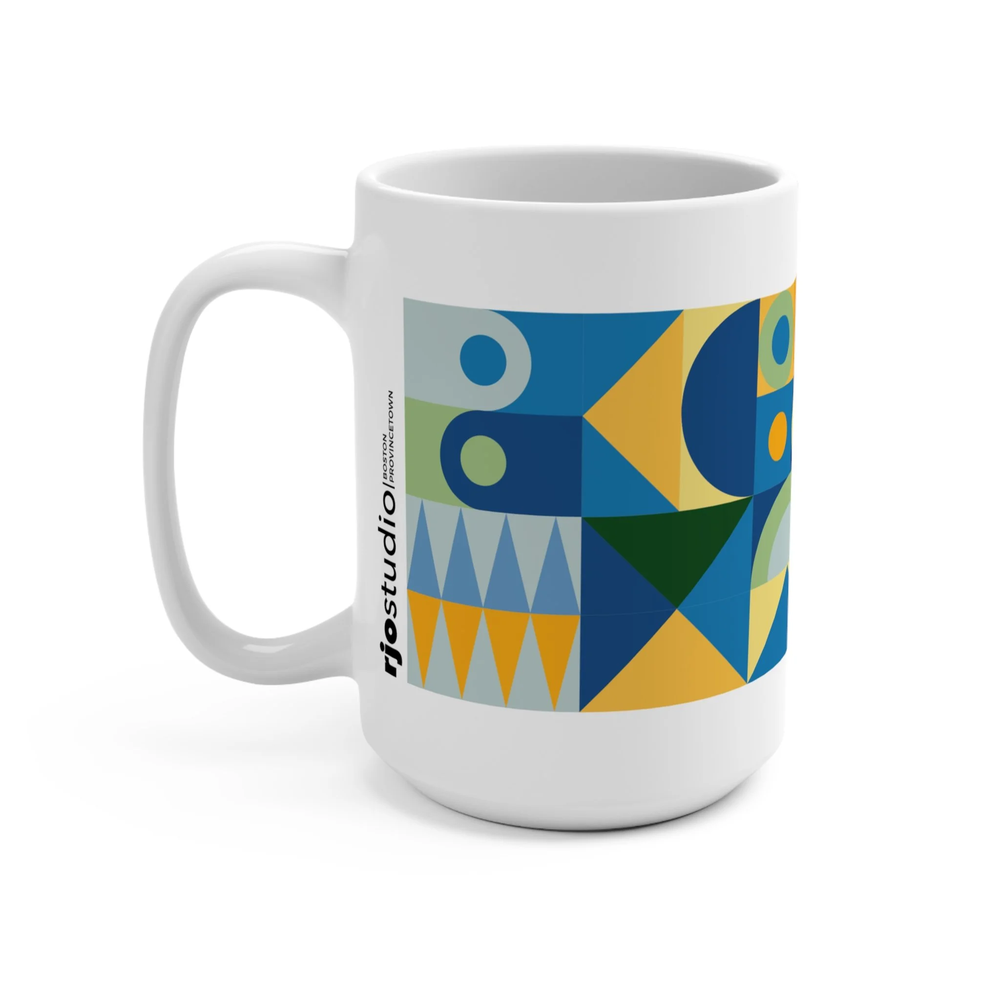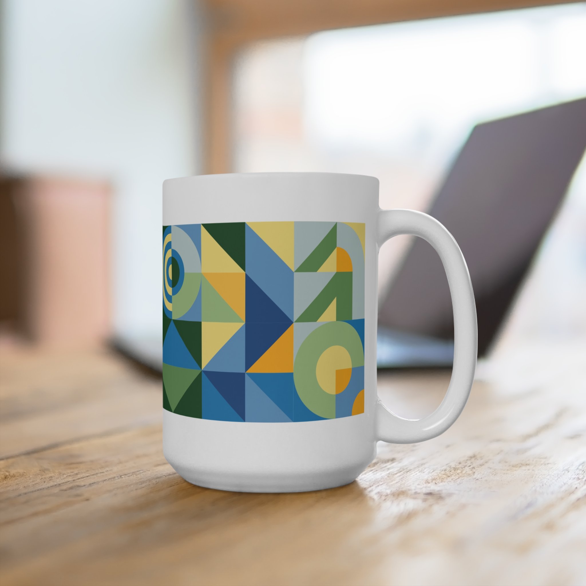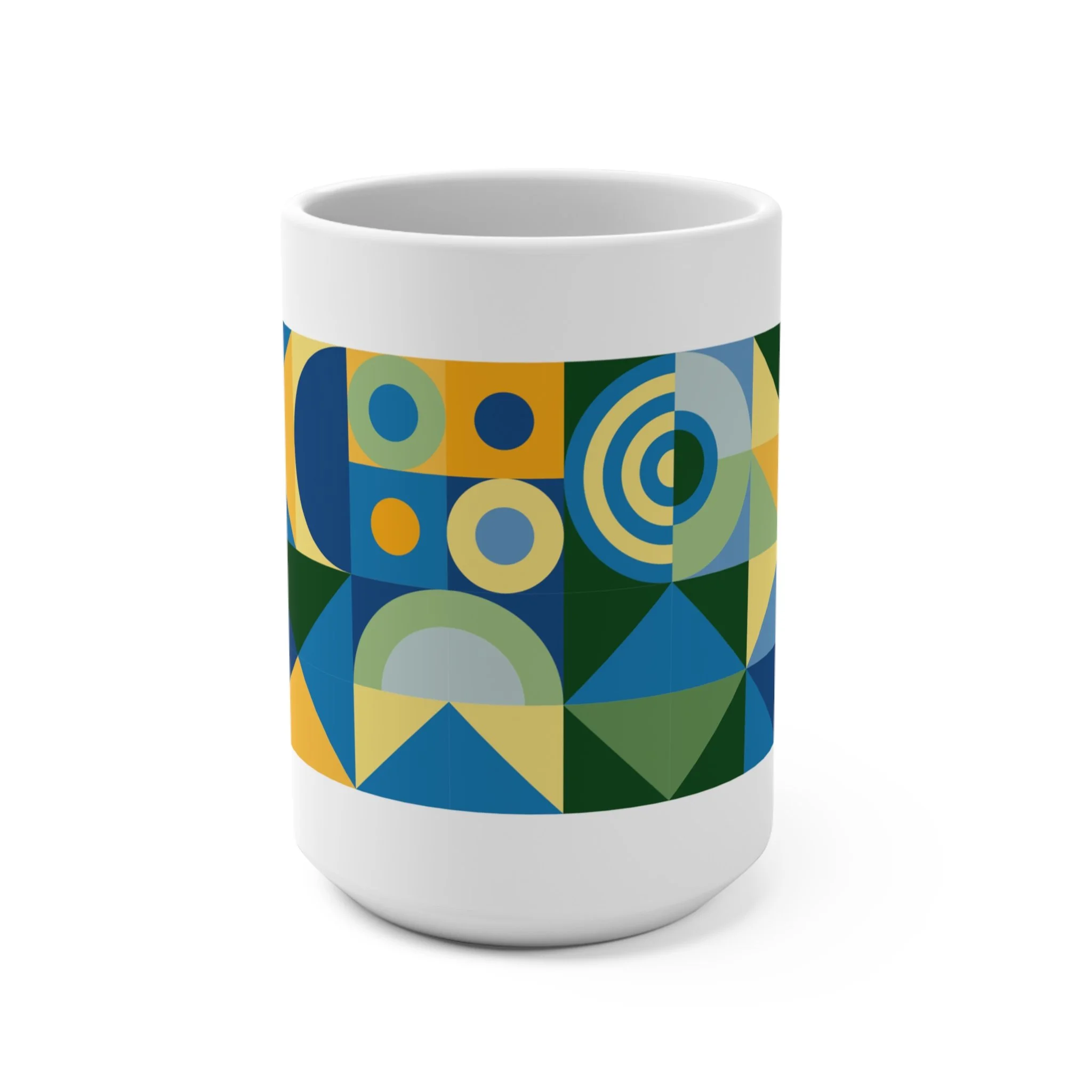 Each Waxing Bauhaus mug wraps a full modular composition around a generous 15oz form — half-circles, triangles, stripes, and arcs intersecting in clean, disciplined rhythms. Rooted in Bauhaus principles but softened through contemporary color, the patterns feel both architectural and expressive.