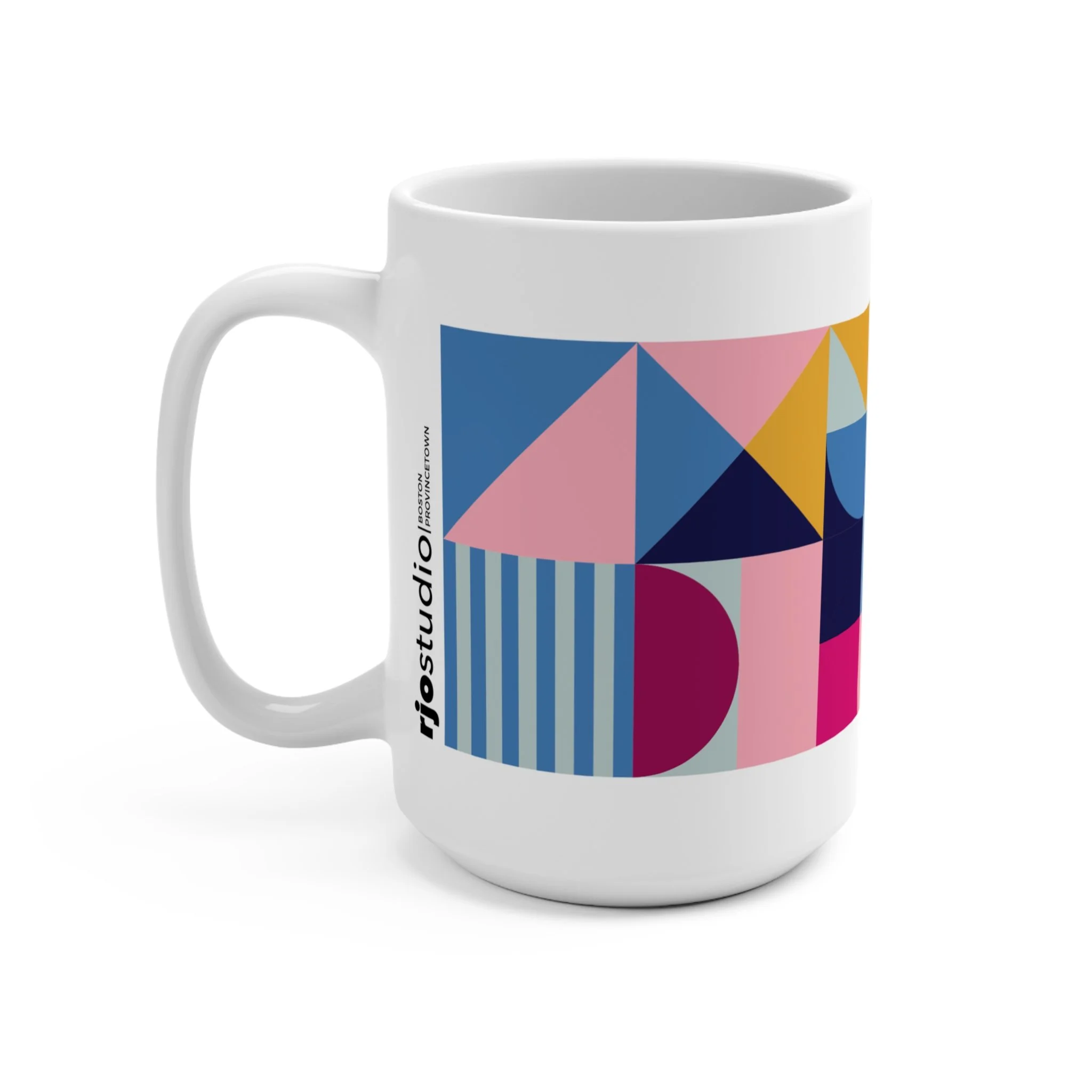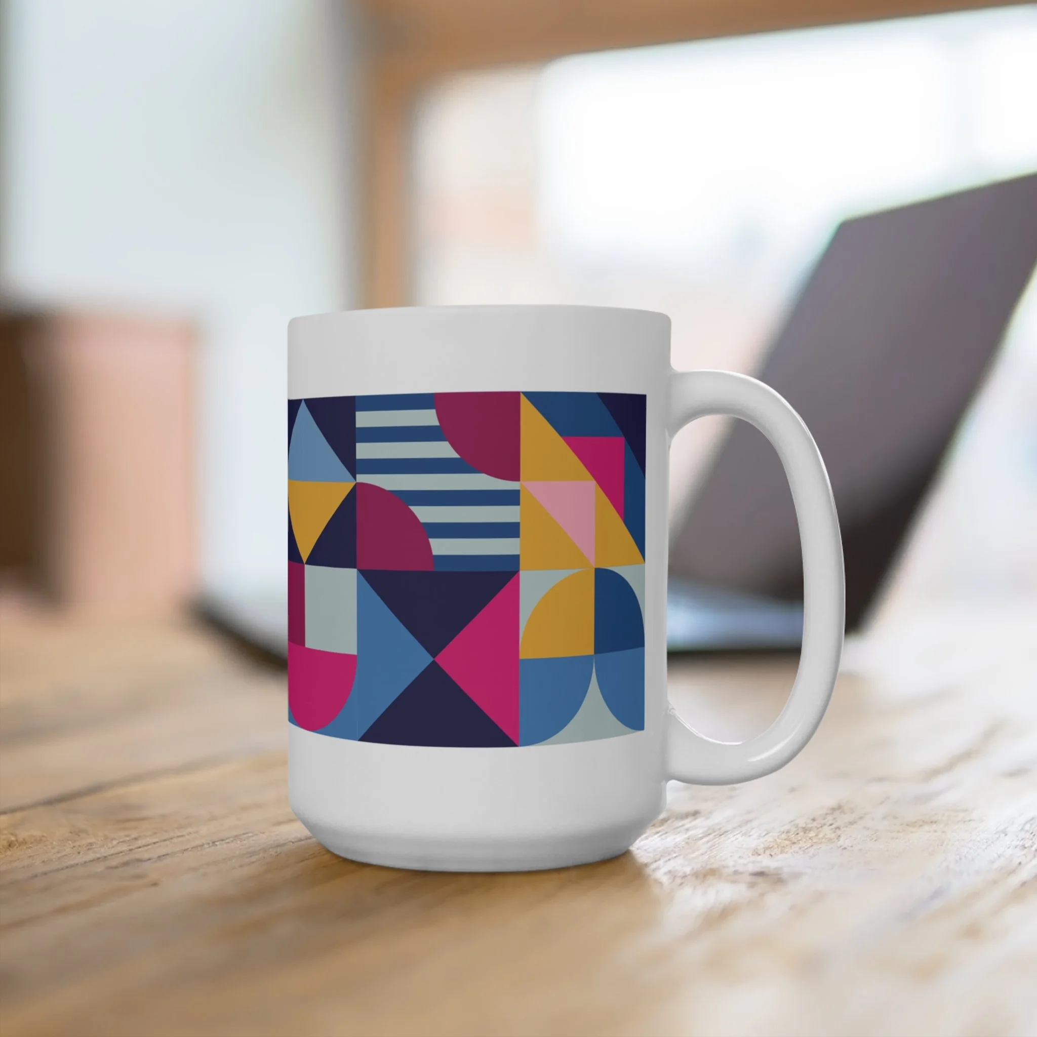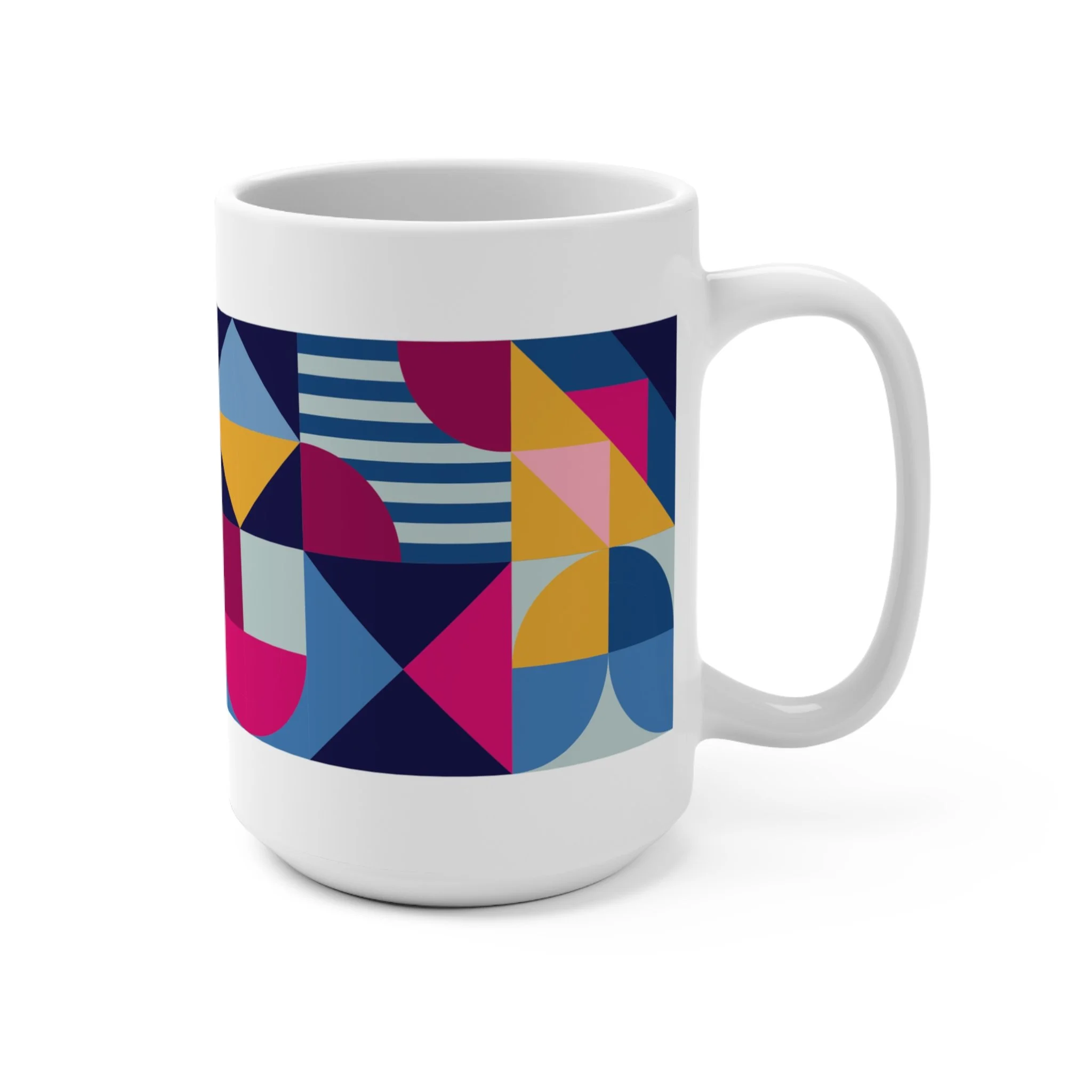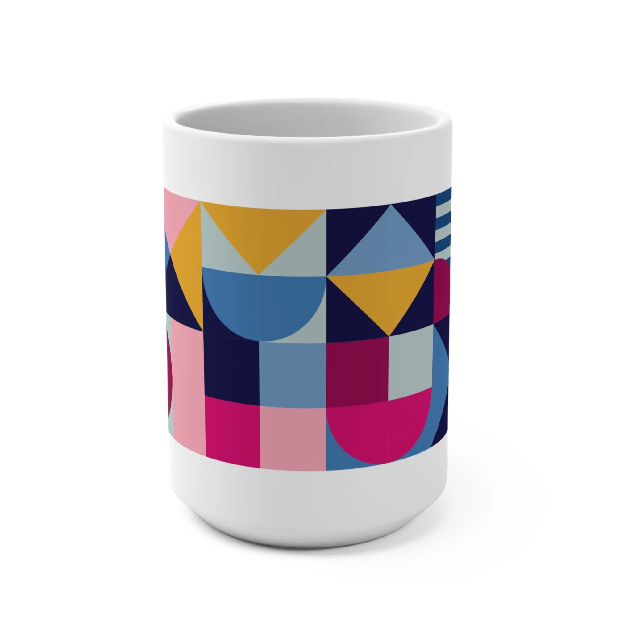 Each Waxing Bauhaus mug wraps a full modular composition around a generous 15oz form — half-circles, triangles, stripes, and arcs intersecting in clean, disciplined rhythms. Rooted in Bauhaus principles but softened through contemporary color, the patterns feel both architectural and expressive.