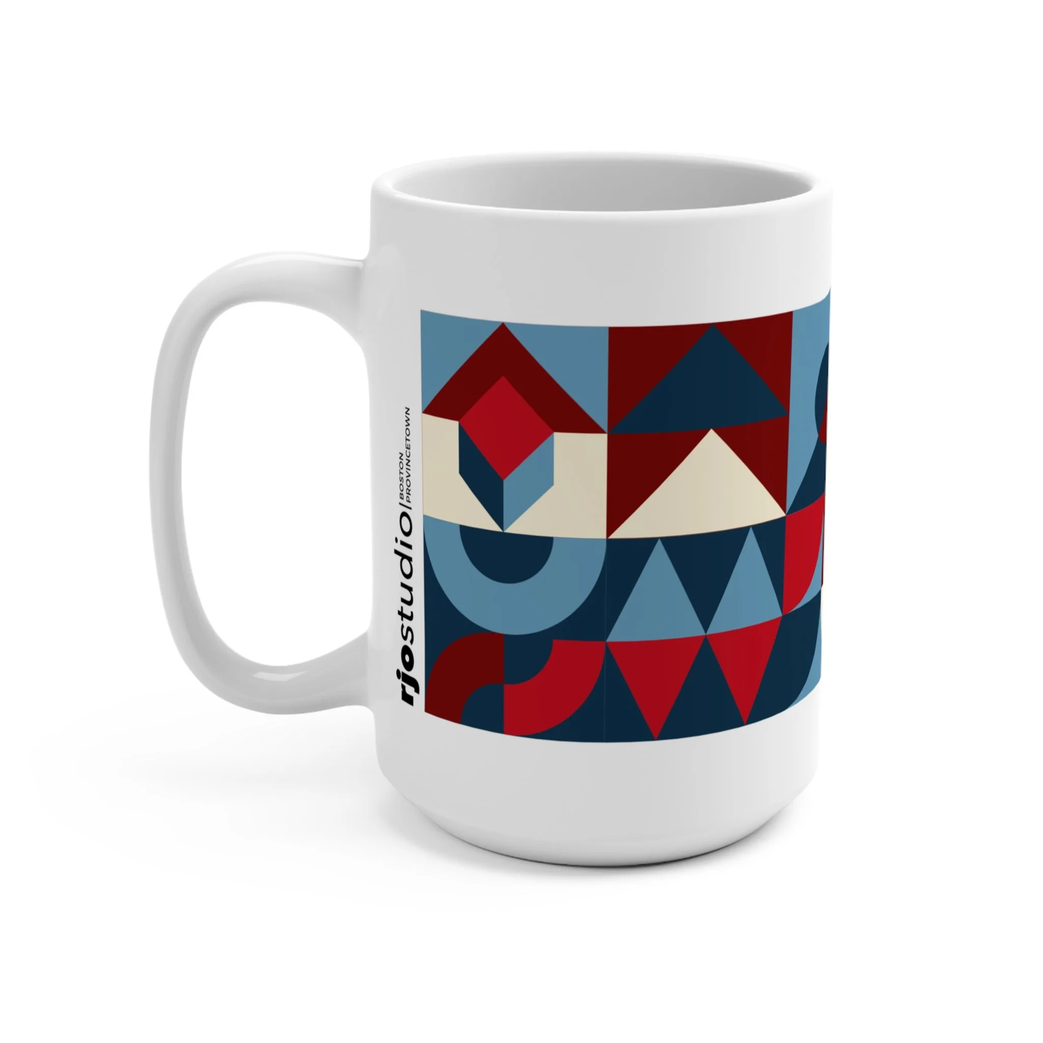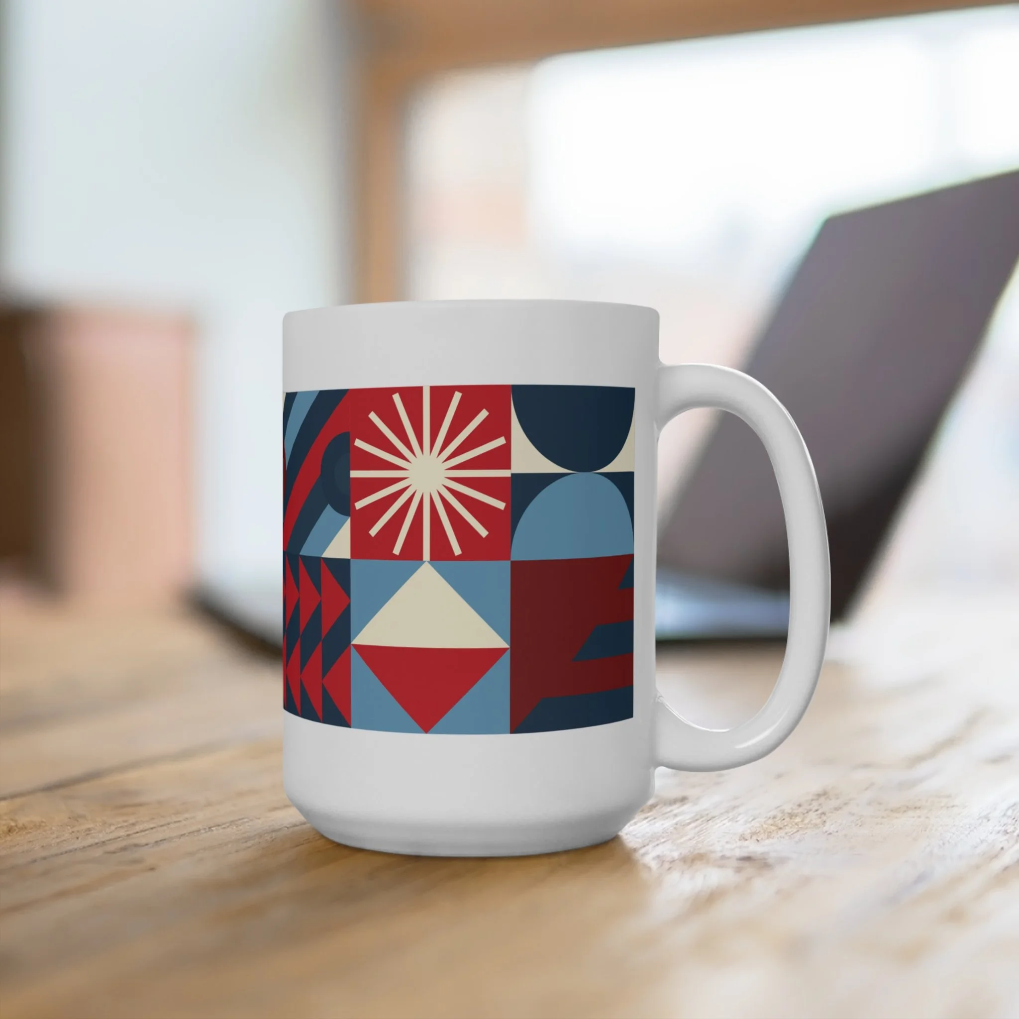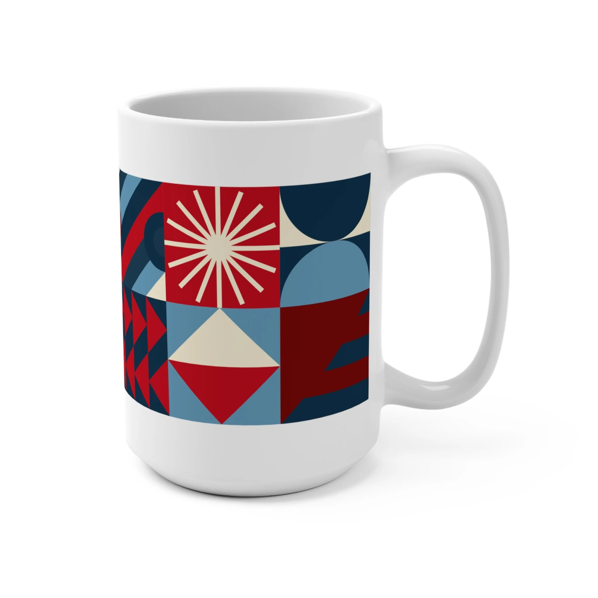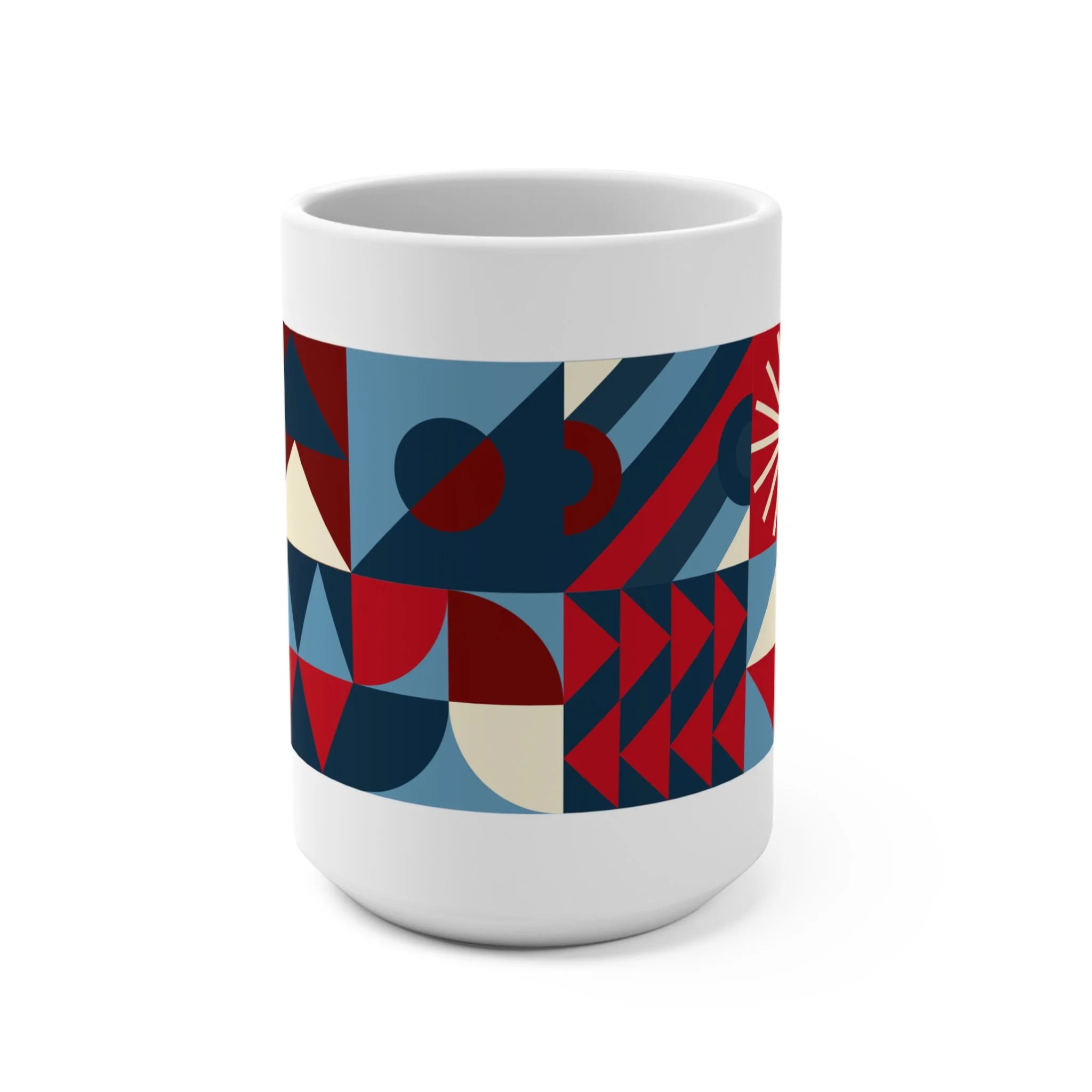 Each Waxing Bauhaus mug wraps a full modular composition around a generous 15oz form — half-circles, triangles, stripes, and arcs intersecting in clean, disciplined rhythms. Rooted in Bauhaus principles but softened through contemporary color, the patterns feel both architectural and expressive.
